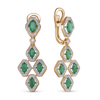 Серьги с 2 бриллиантами природными, 0.03 карат, огранка круг 57 граней, цвет 3, чистота 6, тип огранки А; 206 бриллиантами природными, 0.4 карат, огранка круг 17 граней, цвет 2, чистота 3, тип огранки А; 10 изумрудами природными, 2.39 карат, цвет 3, чистота 3, тип огранки Б; Розовое золото 585 пробы.
