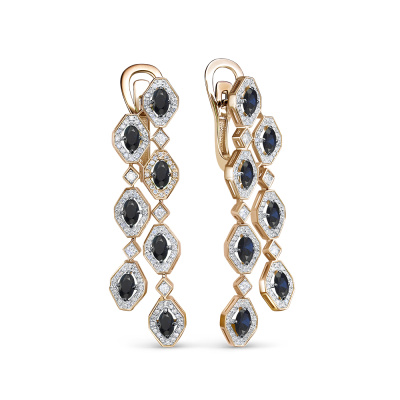Серьги с 10 бриллиантами природными, 0.2 карат, огранка круг 57 граней, цвет 3, чистота 6, тип огранки А; 224 бриллиантами природными, 0.89 карат, огранка круг 17 граней, цвет 2, чистота 3, тип огранки А; 14 сапфирами природными, 4.1 карат, цвет 2, чистота 2, тип огранки Б; Розовое золото 585 пробы.