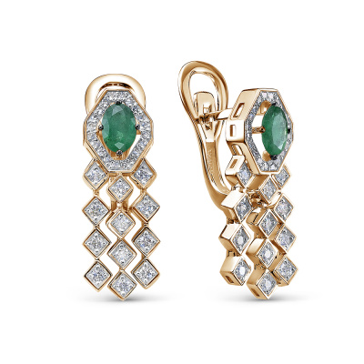 Серьги с 18 бриллиантами природными, 0.37 карат, огранка круг 57 граней, цвет 3, чистота 6, тип огранки А; 6 бриллиантами природными, 0.09 карат, огранка круг 57 граней, цвет 3, чистота 6, тип огранки А; 40 бриллиантами природными, 0.15 карат, огранка круг 17 граней, цвет 2, чистота 3, тип огранки А; 2 изумрудами природными, 0.78 карат, цвет 3, чистота 3, тип огранки Б; Розовое золото 585 пробы.