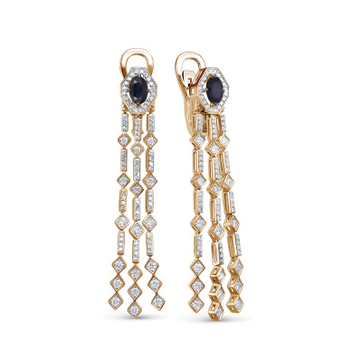 Серьги с 24 бриллиантами природными, 0.49 карат, огранка круг 57 граней, цвет 3, чистота 6, тип огранки А; 12 бриллиантами природными, 0.18 карат, огранка круг 57 граней, цвет 3, чистота 6, тип огранки А; 132 бриллиантами природными, 0.49 карат, огранка круг 17 граней, цвет 2, чистота 3, тип огранки А; 2 сапфирами природными, 1.1 карат, цвет 2, чистота 2, тип огранки Б; Розовое золото 585 пробы.
