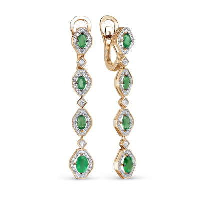 Серьги с 6 бриллиантами природными, 0.13 карат, огранка круг 57 граней, цвет 3, чистота 6, тип огранки А; 128 бриллиантами природными, 0.5 карат, огранка круг 17 граней, цвет 2, чистота 3, тип огранки А; 8 изумрудами природными, 1.59 карат, цвет 3, чистота 3, тип огранки Б; Розовое золото 585 пробы.