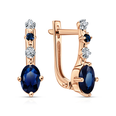 Серьги с 4 бриллиантами природными, 0.03 карат, огранка круг 57 граней, цвет 3, чистота 6, тип огранки А; 2 сапфирами природными, 1.15 карат, цвет 2, чистота 2, тип огранки В; 2 сапфирами природными, 0.05 карат, цвет 2, чистота 2, тип огранки В; Розовое золото 585 пробы.