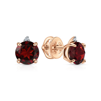 Серьги с 2 бриллиантами природными, 0.01 карат, огранка круг 57 граней, цвет 3, чистота 6, тип огранки А; 2 гранатами природными, 1.99 карат; Розовое золото 585 пробы.