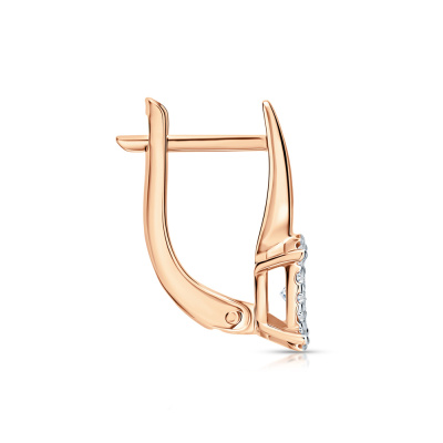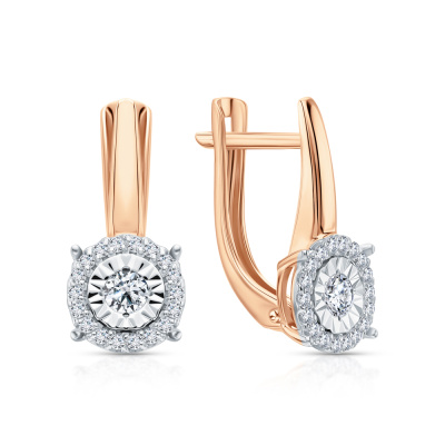 Серьги с 2 бриллиантами природными, 0.15 карат, огранка круг 57 граней, цвет 3, чистота 6, тип огранки А; 36 бриллиантами природными, 0.12 карат, огранка круг 17 граней, цвет 2, чистота 2, тип огранки А; Розовое и белое золото 585 пробы.