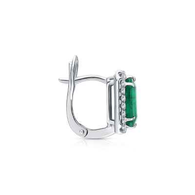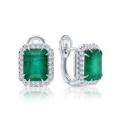 Серьги с 48 бриллиантами природными, 0.36 карат, огранка круг 57 граней, цвет 3, чистота 6, тип огранки А; 2 изумрудами природными, 4.16 карат, цвет 3, чистота 3, тип огранки Б; Белое золото 585 пробы.