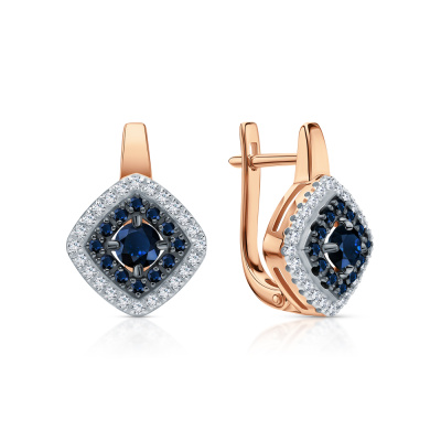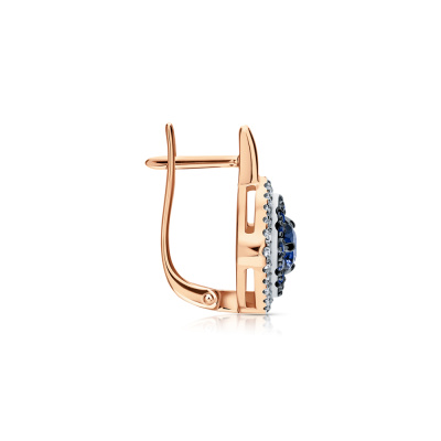 Серьги с 48 бриллиантами природными, 0.23 карат, огранка круг 17 граней, цвет 2, чистота 2, тип огранки А; 2 сапфирами природными, 0.65 карат, цвет 5, чистота 3, тип огранки В; 24 сапфирами природными, 0.25 карат, цвет 2, чистота 2, тип огранки В; Розовое золото 585 пробы.