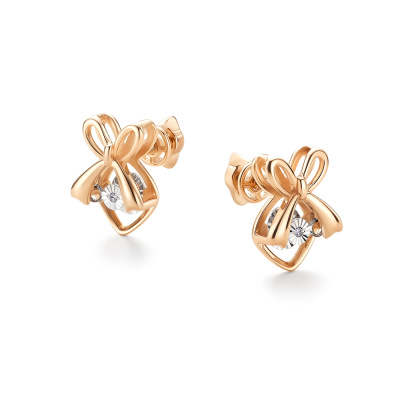 Серьги с 2 бриллиантами природными, 0.007 карат, огранка круг 57 граней, цвет 4, чистота 6, тип огранки А; Розовое золото 585 пробы.