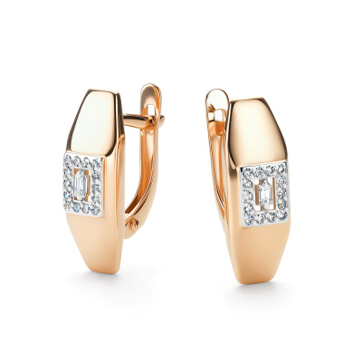 Серьги с 2 бриллиантами природными, 0.03 карат, огранка багет 25 граней, цвет 3, чистота 5, тип огранки А; 28 бриллиантами природными, 0.11 карат, огранка круг 17 граней, цвет 2, чистота 3, тип огранки А; Розовое золото 585 пробы.