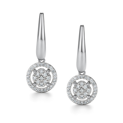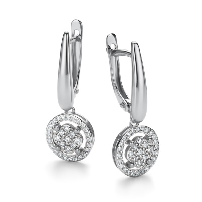 Серьги с 18 бриллиантами природными, 0.12 карат, огранка круг 57 граней, цвет 4, чистота 5, тип огранки А; 48 бриллиантами природными, 0.19 карат, огранка круг 57 граней, цвет 4, чистота 5, тип огранки А; Белое золото 585 пробы.
