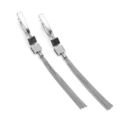 Серьги с 32 бриллиантами природными, 0.1 карат, огранка круг 57 граней, цвет 4, чистота 5, тип огранки А; 18 бриллиантами черными природными облагороженными, 0.06 карат, огранка круг 57 граней, цвет 7, чистота 6, тип огранки А; Белое золото 585 пробы.