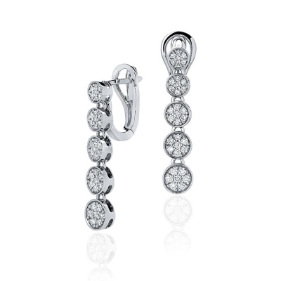 Серьги с 14 бриллиантами природными, 0.24 карат, огранка круг 57 граней, цвет 3, чистота 6, тип огранки А; 14 бриллиантами природными, 0.17 карат, огранка круг 57 граней, цвет 3, чистота 6, тип огранки А; 14 бриллиантами природными, 0.14 карат, огранка круг 57 граней, цвет 4, чистота 5, тип огранки А; 28 бриллиантами природными, 0.18 карат, огранка круг 57 граней, цвет 3, чистота 7, тип огранки А; Белое золото 585 пробы.