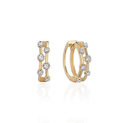 Серьги с 4 бриллиантами природными, 0.11 карат, огранка круг 57 граней, цвет 4, чистота 6, тип огранки А; 8 бриллиантами природными, 0.1 карат, огранка круг 57 граней, цвет 4, чистота 5, тип огранки А; Желтое золото 585 пробы.