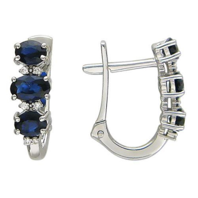 Серьги с 12 бриллиантами природными, 0.04 карат, огранка круг 57 граней, цвет 3, чистота 6, тип огранки А; 2 сапфирами природными, 0.61 карат, цвет 2, чистота 2; 4 сапфирами природными, 0.89 карат, цвет 2, чистота 2; Белое золото 585 пробы.