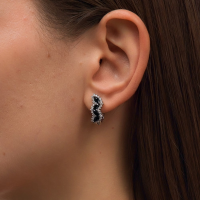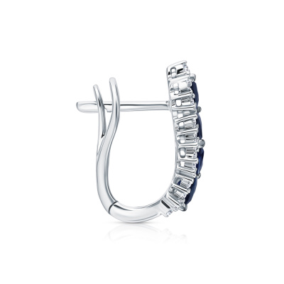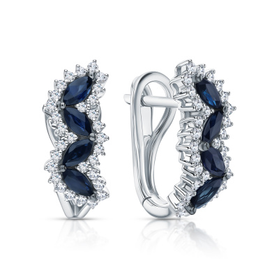 Серьги с 60 бриллиантами природными, 0.59 карат, огранка круг 57 граней, цвет 2, чистота 4, тип огранки А; 8 сапфирами природными, 1.48 карат, цвет 2, чистота 2; Белое золото 585 пробы.
