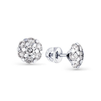Серьги с 2 бриллиантами природными, 0.41 карат, огранка круг 57 граней, цвет 3, чистота 5, тип огранки А; 12 бриллиантами природными, 1.72 карат, огранка круг 57 граней, цвет 3, чистота 5, тип огранки А; Белое золото 585 пробы.