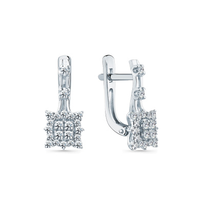 Серьги с 8 бриллиантами природными, 0.15 карат, огранка круг 57 граней, цвет 3, чистота 5, тип огранки А; 20 бриллиантами природными, 0.25 карат, огранка круг 57 граней, цвет 3, чистота 5, тип огранки А; 16 бриллиантами природными, 0.14 карат, огранка круг 57 граней, цвет 3, чистота 5, тип огранки А; Белое золото 585 пробы.