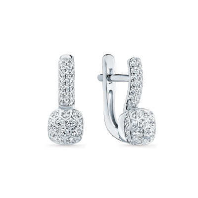 Серьги с 12 бриллиантами природными, 0.15 карат, огранка круг 57 граней, цвет 3, чистота 5, тип огранки А; 78 бриллиантами природными, 0.53 карат, огранка круг 57 граней, цвет 3, чистота 5, тип огранки А; 4 бриллиантами природными, 0.01 карат, огранка круг 57 граней, цвет 3, чистота 5, тип огранки А; Белое золото 585 пробы.
