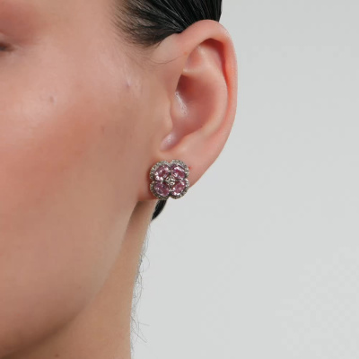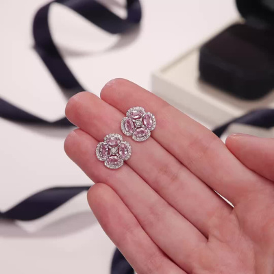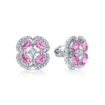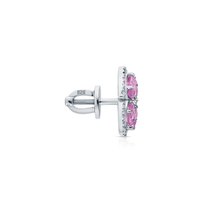 Серьги с 2 бриллиантами природными, 0.05 карат, огранка круг 57 граней, цвет 3, чистота 5, тип огранки А; 56 бриллиантами природными, 0.2 карат, огранка круг 57 граней, цвет 3, чистота 5, тип огранки А; 8 сапфирами розовыми природными, 2.39 карат, тип огранки Б; Белое золото 585 пробы.
