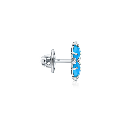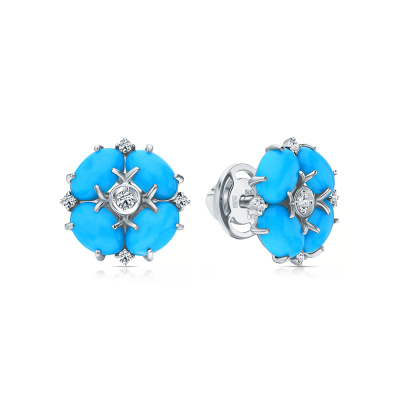 Серьги с 2 бриллиантами природными, 0.04 карат, огранка круг 57 граней, цвет 3, чистота 5, тип огранки А; 8 бриллиантами природными, 0.05 карат, огранка круг 57 граней, цвет 3, чистота 5, тип огранки А; 8 бирюзами, тип огранки Б; Белое золото 585 пробы.