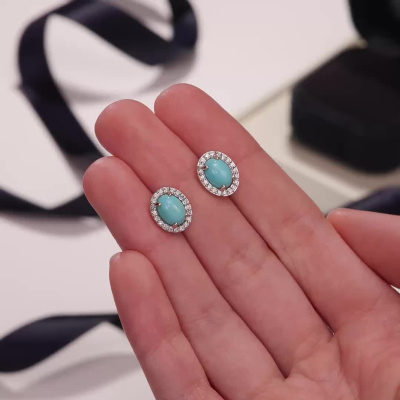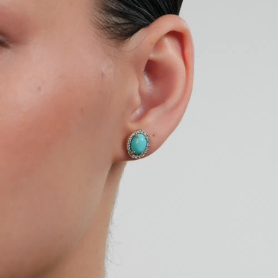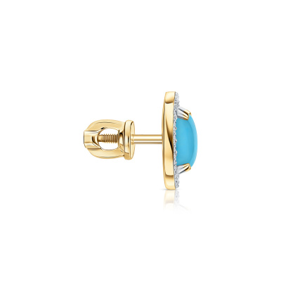 Серьги с 40 бриллиантами природными, 0.26 карат, огранка круг 57 граней, цвет 3, чистота 5, тип огранки А; 2 бирюзами, тип огранки Б; Желтое золото 585 пробы.