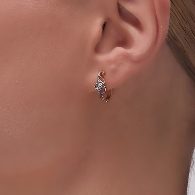 Серьги с 2 бриллиантами природными, 0.04 карат, огранка круг 57 граней, цвет 4, чистота 5, тип огранки А; Розовое и белое золото 585 пробы.