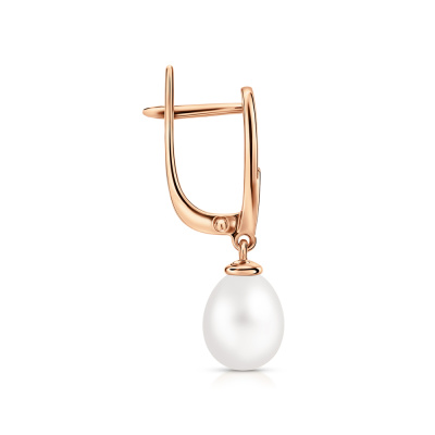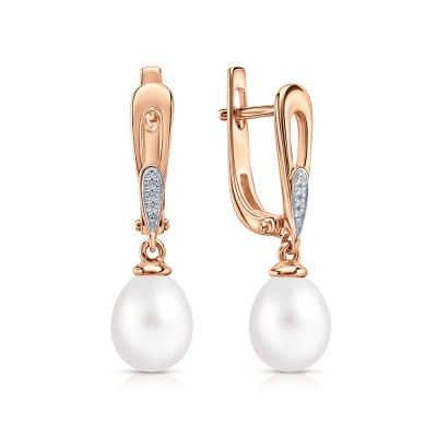 Серьги с 8 бриллиантами природными, 0.01 карат, огранка круг 17 граней, цвет 2, чистота 2, тип огранки А; 2 жемчугами пресноводными культ.белыми, тип огранки Б; Розовое золото 585 пробы.