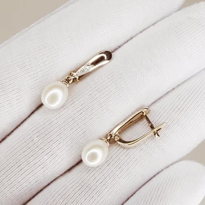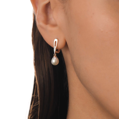 Серьги с 8 бриллиантами природными, 0.01 карат, огранка круг 17 граней, цвет 2, чистота 2, тип огранки А; 2 жемчугами пресноводными культ.белыми; Розовое золото 585 пробы.