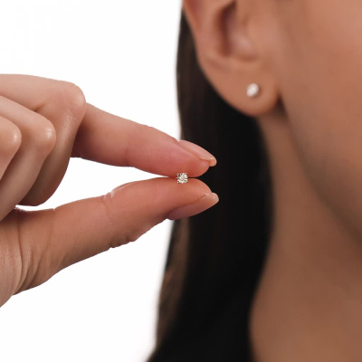 Золотые серьги с двумя бриллиантами, огранка круг 57 граней, 0.029 карат, цвет 3, чистота 5, тип огранки А; 585 пробы. Вес изделия составляет 1.02 г. Украшения из этой коллекции привлекают своим блеском, благодаря использованию алмазного диска, который визуально увеличивает и эффектно представляет бриллианты. Изготовлено в России.
