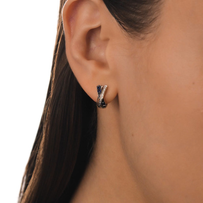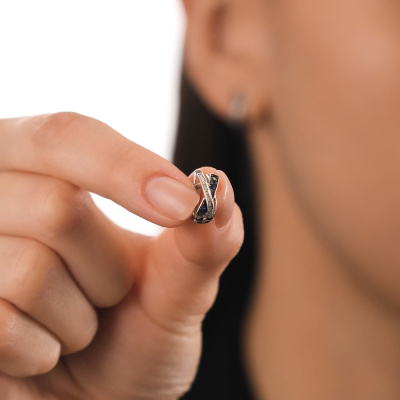 Элегантная классика в новом прочтении. Серьги выполнены из белого золота с бриллиантами и сапфирами. Визуальный объем серьгам придают легкие, воздушные пересекающиеся линии.Занижение штифта у серег способствует наиболее комфортной посадке на мочке уха.