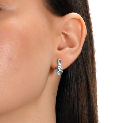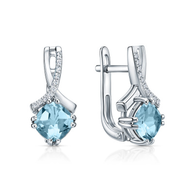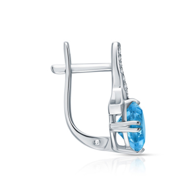 Серьги с 20 бриллиантами природными, 0.03 карат, огранка круг 17 граней, цвет 2, чистота 2, тип огранки А; 2 топазами скай природными, 2.28 карат; Белое золото 585 пробы.