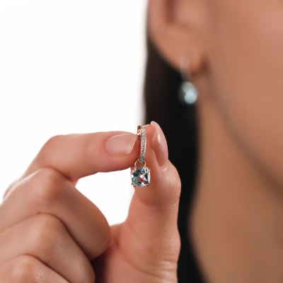 Серьги с 22 бриллиантами природными, 0.05 карат, огранка круг 17 граней, цвет 2, чистота 2, тип огранки А; 2 топазами скай природными, 3.59 карат, тип огранки Б; Розовое золото 585 пробы.