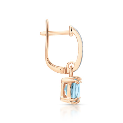 Серьги с 22 бриллиантами природными, 0.05 карат, огранка круг 17 граней, цвет 2, чистота 2, тип огранки А; 2 топазами скай природными, 3.71 карат; Розовое золото 585 пробы.