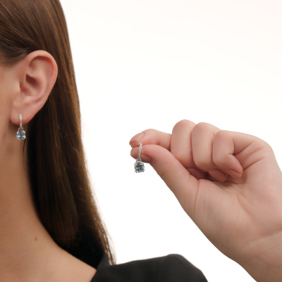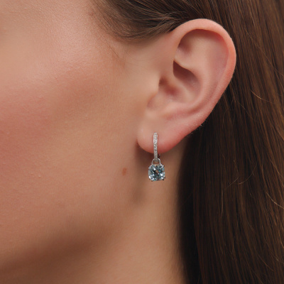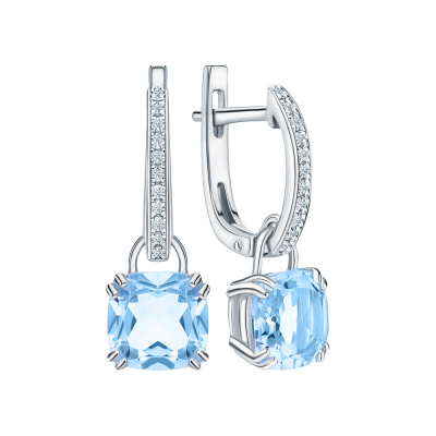 Серьги с 22 бриллиантами природными, 0.05 карат, огранка круг 17 граней, цвет 2, чистота 2, тип огранки А; 2 топазами скай природными, 3.66 карат; Белое золото 585 пробы.