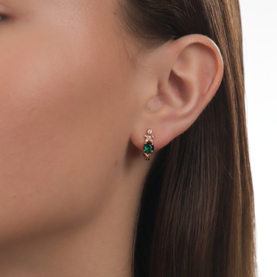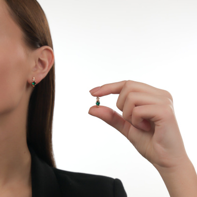 Серьги с 2 бриллиантами природными, 0.01 карат, огранка круг 17 граней, цвет 2, чистота 2, тип огранки А; 2 гидротермальными изумрудами, 0.92 карат; Розовое золото 585 пробы.