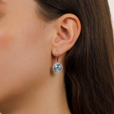 Серьги с 76 бриллиантами природными, 0.16 карат, огранка круг 17 граней, цвет 2, чистота 2, тип огранки А; 2 топазами скай природными, 9.42 карат; Розовое золото 585 пробы.