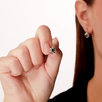 Серьги с 12 бриллиантами природными, 0.05 карат, огранка круг 17 граней, цвет 2, чистота 2, тип огранки А; 2 сапфирами природными, 0.4 карат, цвет 2, чистота 2, тип огранки Б; Розовое и белое золото 585 пробы.