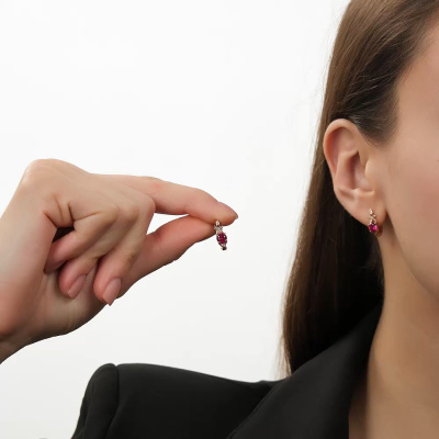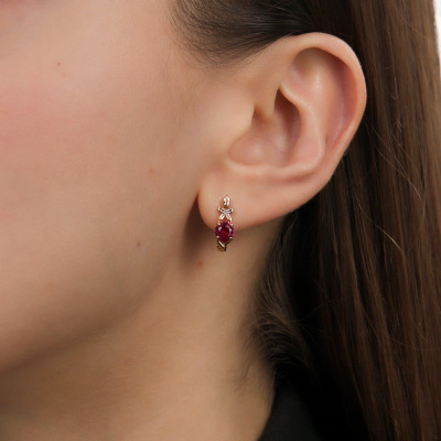 Серьги с 2 бриллиантами природными, 0.01 карат, огранка круг 17 граней, цвет 2, чистота 2, тип огранки Б; 2 рубинами синтетическими, 1.18 карат; Розовое золото 585 пробы.
