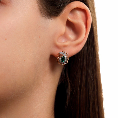 Серьги с 38 бриллиантами природными, 0.11 карат, огранка круг 17 граней, цвет 2, чистота 2, тип огранки А; 2 гидротермальными изумрудами, 0.66 карат; Розовое золото 585 пробы.