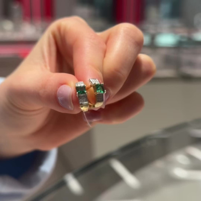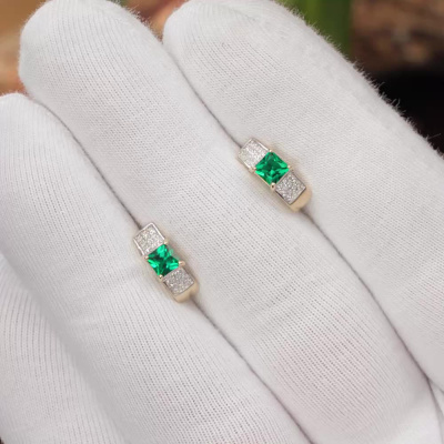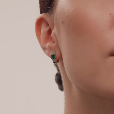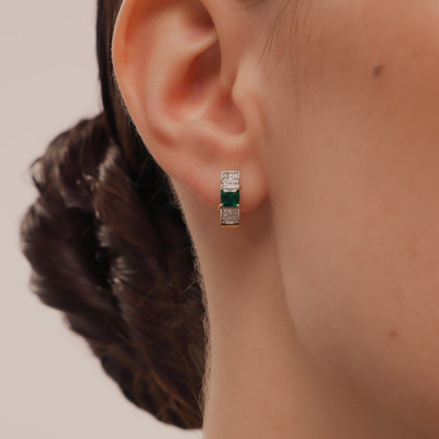 Стильная геометрия. Серьги выполнены из желтого золота с крупными изумрудами и бриллиантами станут ярким акцентом в элегантном образе, Занижение штифта у серег способствует наиболее комфортной посадке на мочке уха.