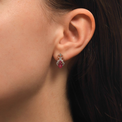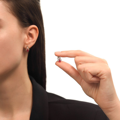 Серьги с 40 бриллиантами природными, 0.08 карат, огранка круг 17 граней, цвет 2, чистота 2, тип огранки А; 2 рубинами природными, 0.88 карат, цвет 2, чистота 2, тип огранки Б; 2 рубинами природными, 0.06 карат, цвет 2, чистота 2, тип огранки В; Розовое золото 585 пробы.