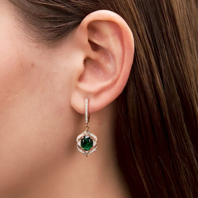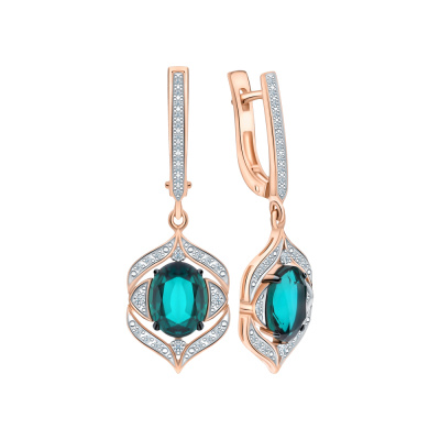 Серьги с 8 бриллиантами природными, 0.12 карат, огранка круг 17 граней, цвет 2, чистота 2, тип огранки А; 46 бриллиантами природными, 0.18 карат, огранка круг 17 граней, цвет 2, чистота 2, тип огранки А; 2 гидротермальными изумрудами, 2.65 карат; Розовое золото 585 пробы.