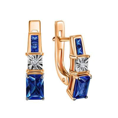 Серьги с 2 бриллиантами природными, 0.04 карат, огранка круг 57 граней, цвет 3, чистота 6, тип огранки А; 2 сапфирами синтетическими, 1.29 карат; 4 сапфирами синтетическими, 0.22 карат; Розовое и белое золото 585 пробы.