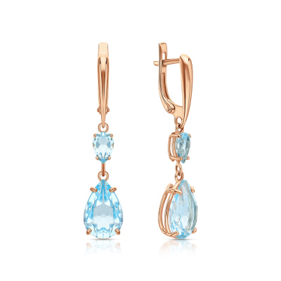 Серьги с 2 топазами скай природными, 6.6 карат; 2 топазами скай природными, 0.97 карат; Розовое золото 585 пробы.