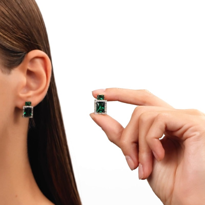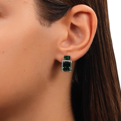 Серьги с 64 бриллиантами природными, 0.19 карат, огранка круг 17 граней, цвет 2, чистота 2, тип огранки А; 2 гидротермальными изумрудами, 3.89 карат; 2 гидротермальными изумрудами, 0.97 карат; Желтое золото 585 пробы.