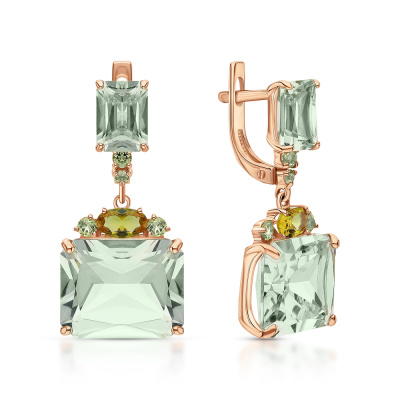 Серьги с 2 аметистами зелеными, 9.94 карат; 2 аметистами зелеными, 1.73 карат; 2 ситаллами султанит, 0.46 карат; 6 хризолитами природными, 0.21 карат; 2 хризолитами природными, 0.03 карат; Розовое золото 585 пробы.