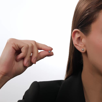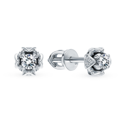 Серьги с 2 бриллиантами природными, 0.16 карат, огранка круг 57 граней, цвет 3, чистота 6, тип огранки А; 24 бриллиантами природными, 0.04 карат, огранка круг 17 граней, цвет 2, чистота 2, тип огранки А; Белое золото 585 пробы.