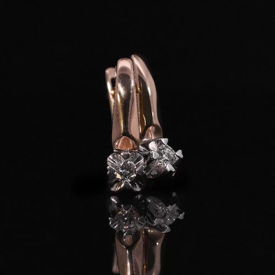 Серьги с 2 бриллиантами природными, 0.15 карат, огранка круг 57 граней, цвет 3, чистота 6, тип огранки А; Розовое золото 585 пробы.