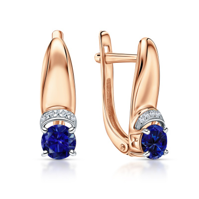Серьги с 6 бриллиантами природными, 0.02 карат, огранка круг 17 граней, цвет 2, чистота 2, тип огранки Б; 4 бриллиантами природными, 0.01 карат, огранка круг 17 граней, цвет 2, чистота 2, тип огранки Б; 2 сапфирами синтетическими, 1.2 карат; Розовое золото 585 пробы.