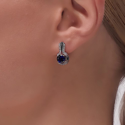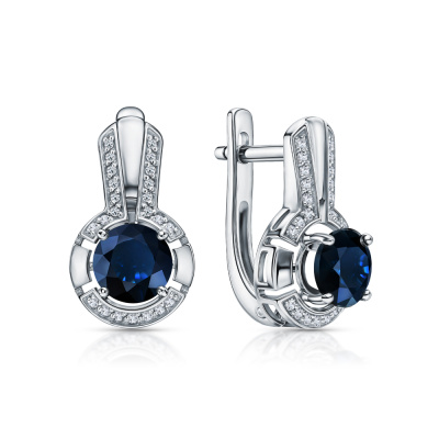 Серьги с 46 бриллиантами природными, 0.14 карат, огранка круг 17 граней, цвет 2, чистота 2, тип огранки Б; 2 сапфирами синтетическими, 2.06 карат; Белое золото 585 пробы.