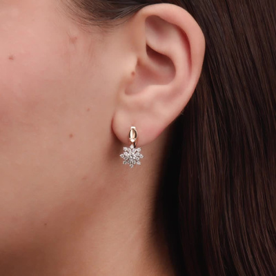 Серьги с 2 бриллиантами природными, 0.31 карат, огранка круг 57 граней, цвет 3, чистота 6, тип огранки А; 32 бриллиантами природными, 0.39 карат, огранка круг 57 граней, цвет 3, чистота 6, тип огранки А; Розовое и белое золото 585 пробы.